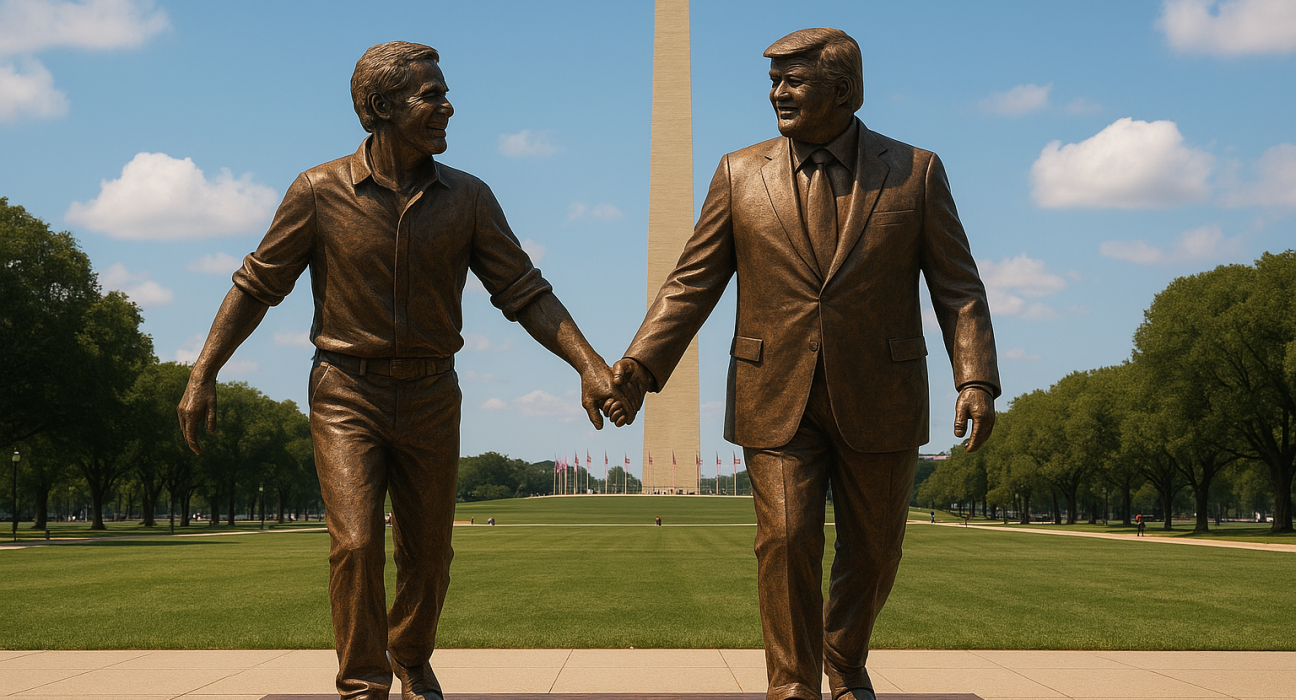 On September 23, 2025, a 12-foot statue depicting Donald Trump and Jeffrey Epstein holding hands appeared on the National Mall in Washington, D.C. The artwork, made of foam, resin, wood, and wire, shows the two men smiling at one another as if about to frolic toward the Washington Monument