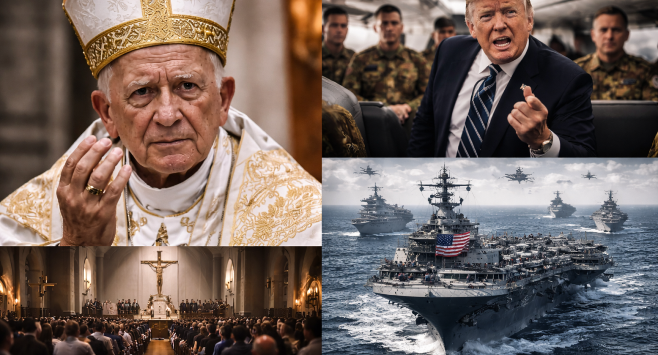 At the center of the moment are three key developments: criticism from Pope Leo XIV, declining Catholic support for Trump, and controversial imagery circulating in political media—occurring alongside a significant military escalation in the form of a planned naval blockade of Iran.